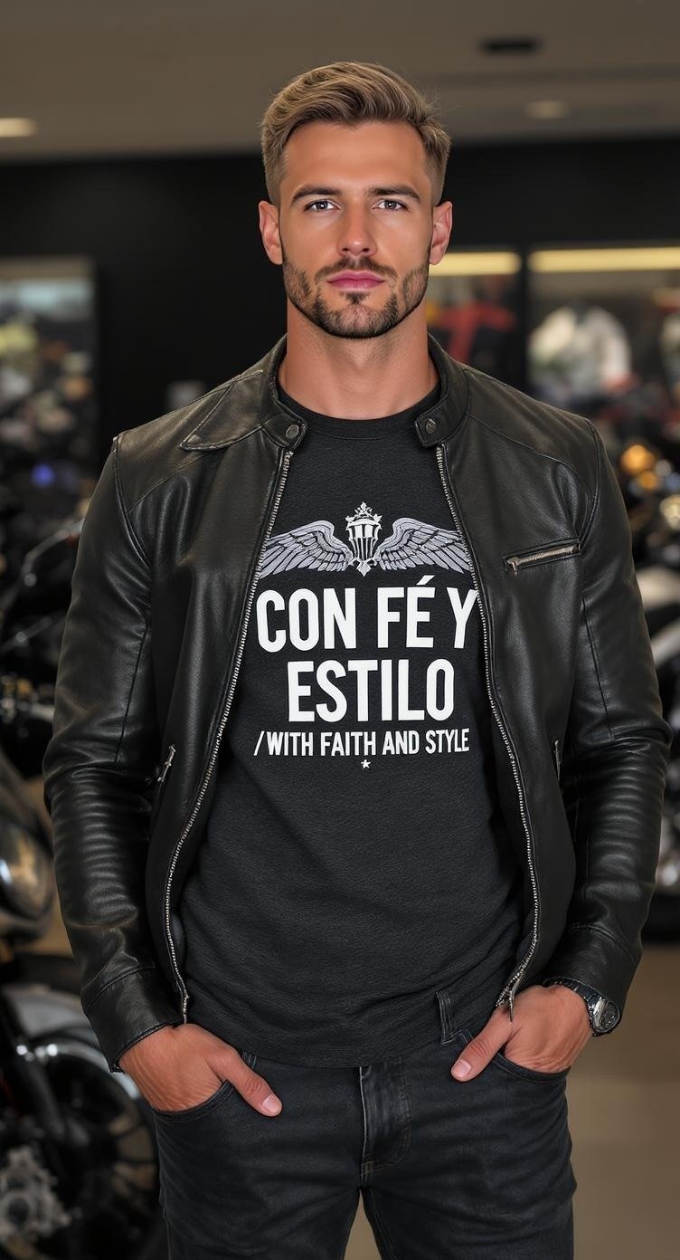 This sleek black t-shirt takes style to the next level when paired with a chic leather jacket. The bold “Con Fé Y Estilo / With Faith and Style” print embodies the spirit of confidence and strength. Designed for both fashion and comfort, this shirt is made from high-quality cotton that ensures breathability and a perfect fit. Wear it to make a statement at social events or casual outings for a stylish, modern look that stands out.