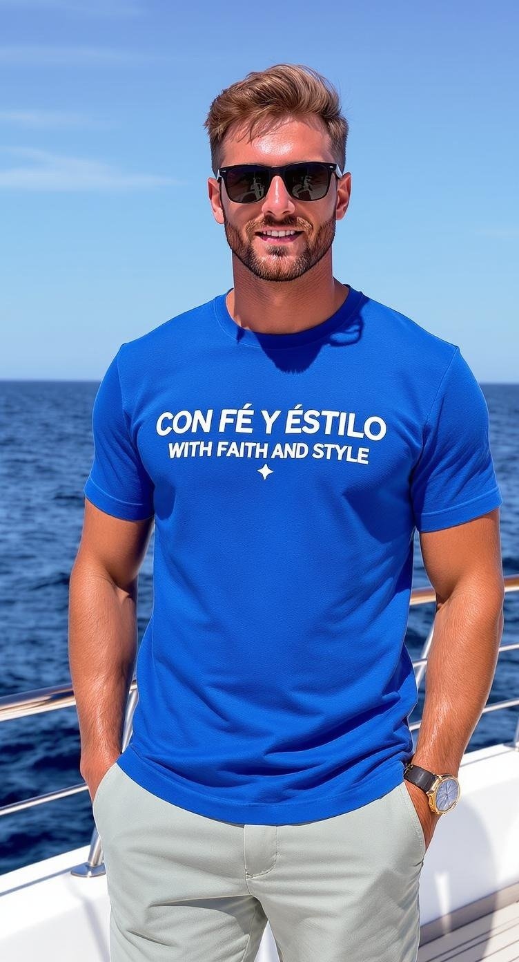 This bright blue t-shirt is perfect for beach days or casual weekend outings. The “Con Fé Y Estilo / With Faith and Style” print adds an empowering touch to the laid-back style. Crafted from soft cotton, it offers a comfortable fit, keeping you cool and stylish wherever you go. Pair it with shorts or denim for a breezy, casual look that stands out.